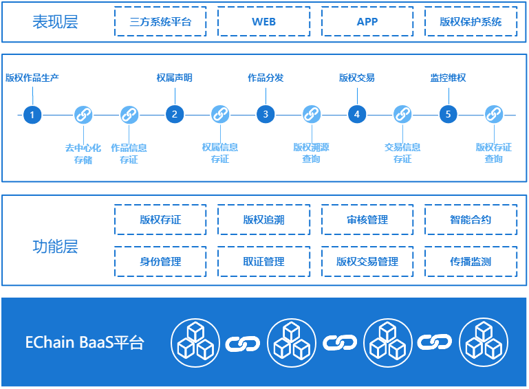 易鏈云區(qū)塊鏈版權(quán)保護(hù)系統(tǒng)基于EChain BaaS平臺(tái)為底層架構(gòu)搭建。EChain BaaS的高性能以及高安全性特性為易鏈云區(qū)塊鏈版權(quán)保護(hù)系統(tǒng)賦能。系統(tǒng)覆蓋版權(quán)保護(hù)鏈條全部環(huán)節(jié),用戶可基于自身系統(tǒng)情況進(jìn)行功能和特性定制化。通過本系統(tǒng),版權(quán)方可大幅降低維權(quán)成本,降低維權(quán)難度,監(jiān)管方也可大幅降低監(jiān)管難度。