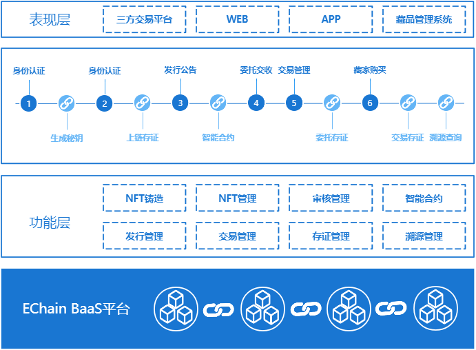EChain數(shù)字藏品交易系統(tǒng)依托區(qū)塊鏈技術(shù),實(shí)現(xiàn)數(shù)字藏品資產(chǎn)化,并且保證藏品唯一性、真實(shí)性和永久性,并有效解決了確權(quán)問(wèn)題。系統(tǒng)實(shí)現(xiàn)數(shù)字藏品行業(yè)端對(duì)端覆蓋,收藏者能夠方便的進(jìn)行藏品投資,創(chuàng)作者也能夠快速有效的完成藏品制作和發(fā)行。EChain數(shù)字藏品交易系統(tǒng)配備了溯源功能,數(shù)字藏品的全部交易數(shù)據(jù)完全公開(kāi)透明,目的在于打造一個(gè)公平公正的收藏品交易市場(chǎng)。